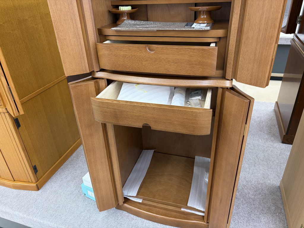 扉を開くと、内部にはご本尊や仏具を落ち着いてお祀りできるシンプルで整った空間が広がり、段差のある棚構造が仏具の配置を美しくサポートします。上段にはご本尊を安置するためのスペースが確保され、下段にはお供え物や仏具を置きやすい広さを備えています。さらに、引き出しや収納スペースも設けられており、線香やローソクなどの小物をすっきりと収められる実用性の高さも魅力です。