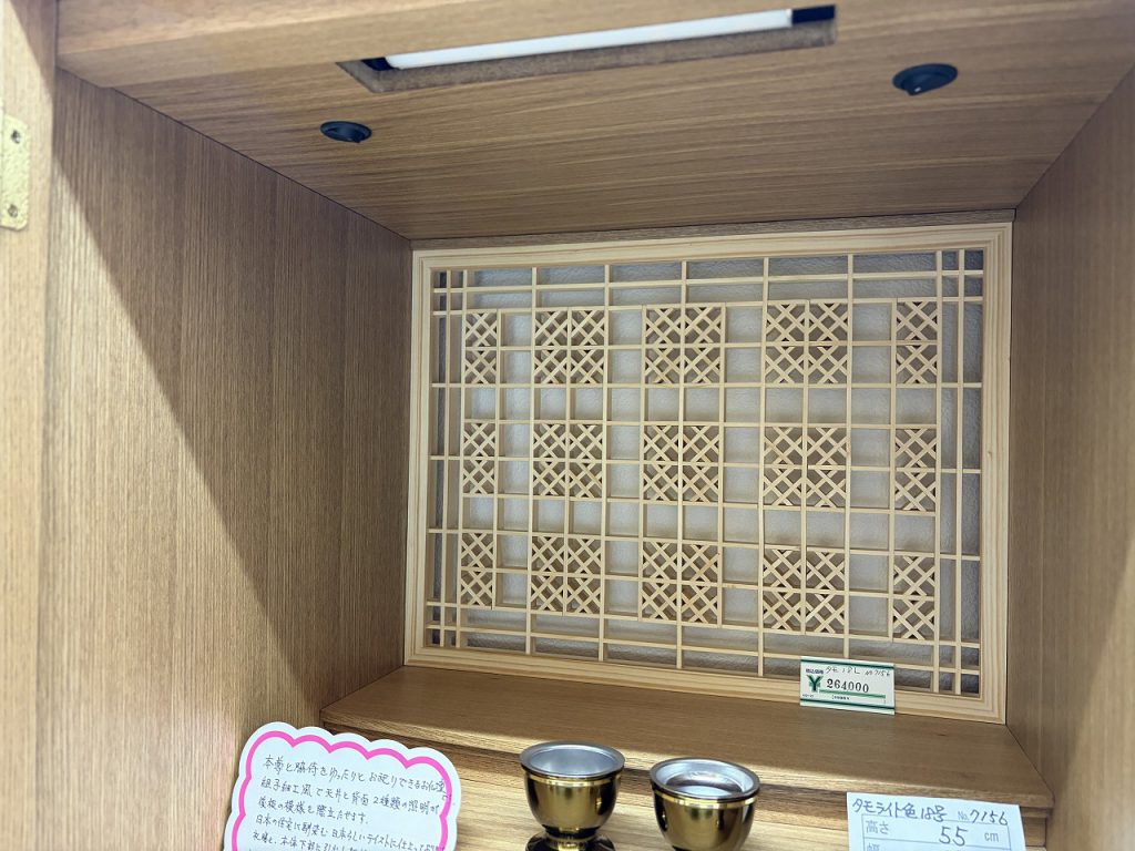 内部の背面には、職人の技が光る格子状の組子をあしらい、柔らかな光を通しながら奥行きと気品を演出。シンプルな外観の中に、日本の伝統美をさりげなく取り入れた一台となっています。